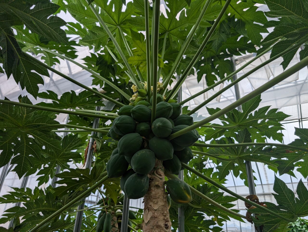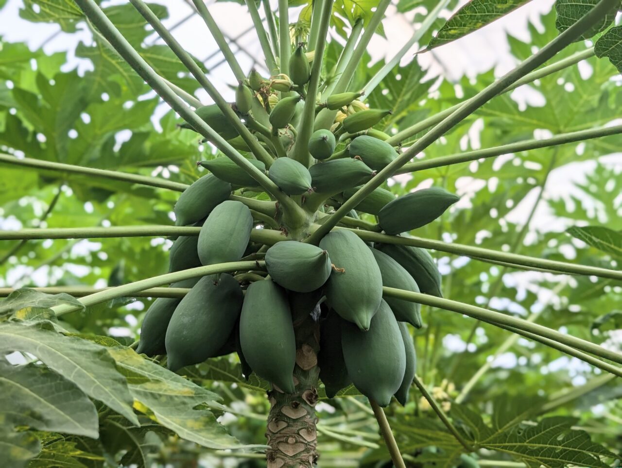 ビニールハウスの中を覗くと海外の南国に来たかのような空間で、きれいな緑色の青パパイヤの木がたくさん植えられていて、見上げると数えきれないほどの青パパイヤの実がなっていました。