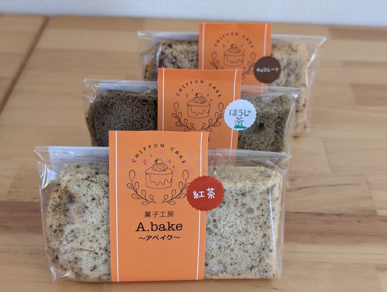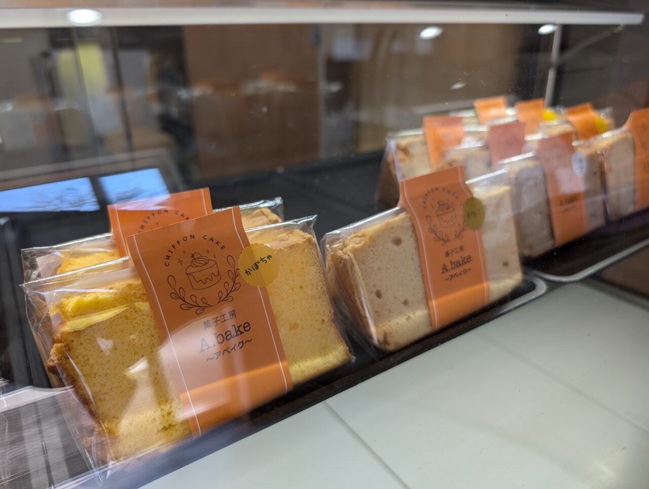 アベイクはシフォンケーキの直売工房となっていて、店内に入るとすぐにシフォンケーキがガラスケースに並べられていました。