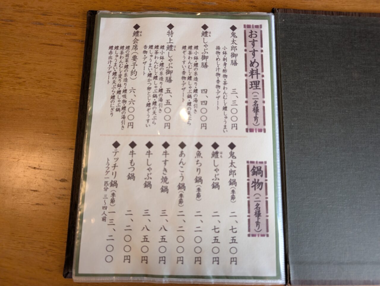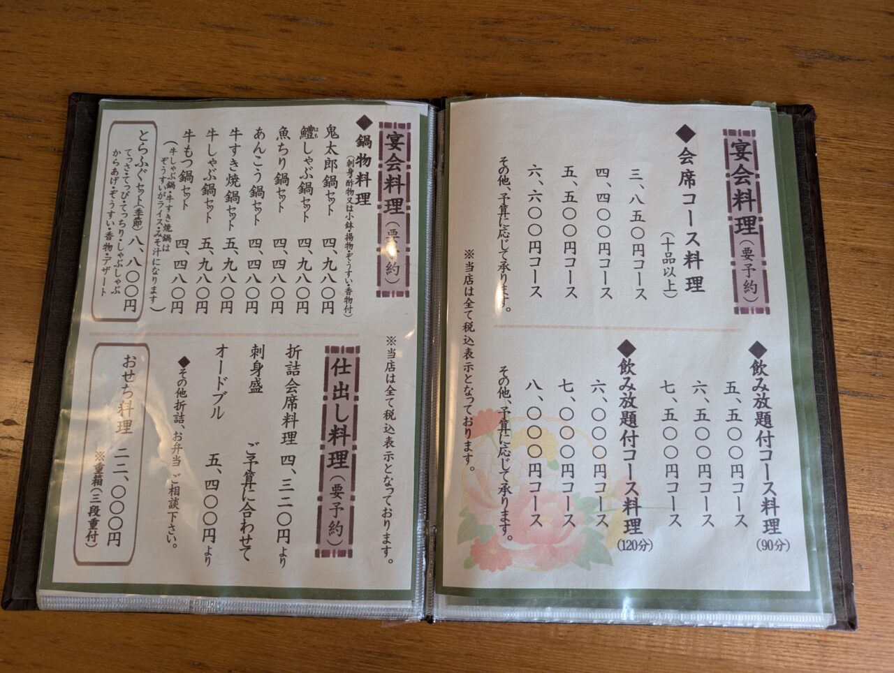 メニューは会席、定食、鍋物など用途に応じて選ぶことができます。