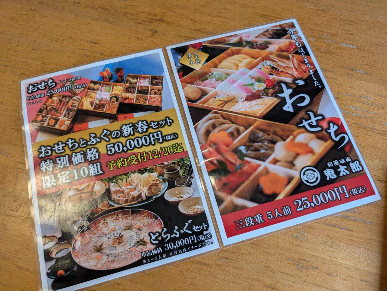 新しい年をお祝いする準備におせちの販売、受付もしています。2025年は12月20日までの予約となっています。