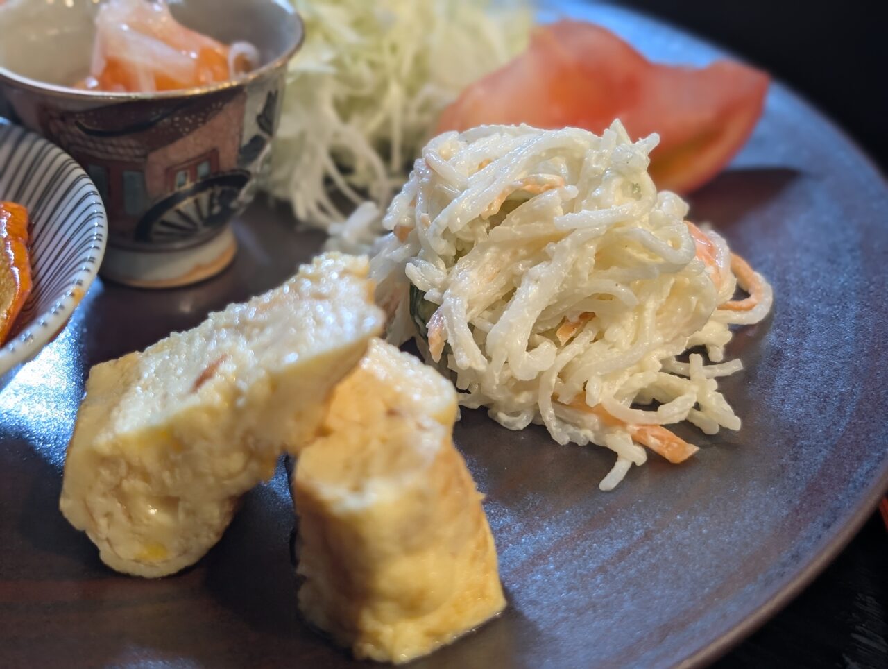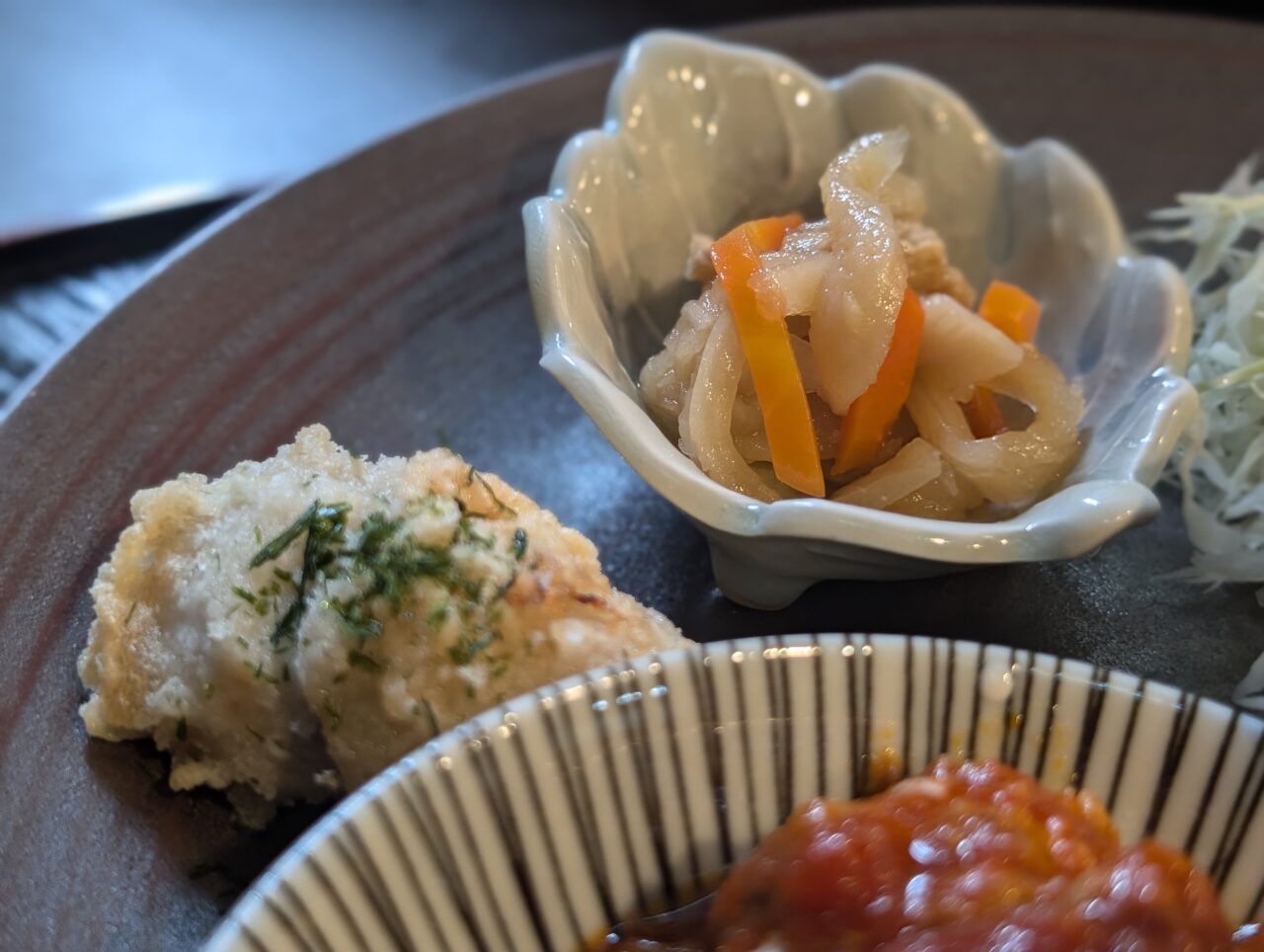 副菜にはビーフンのサラダ、柿と玉ねぎのマリネ、さといものからあげ、切り干し大根です。