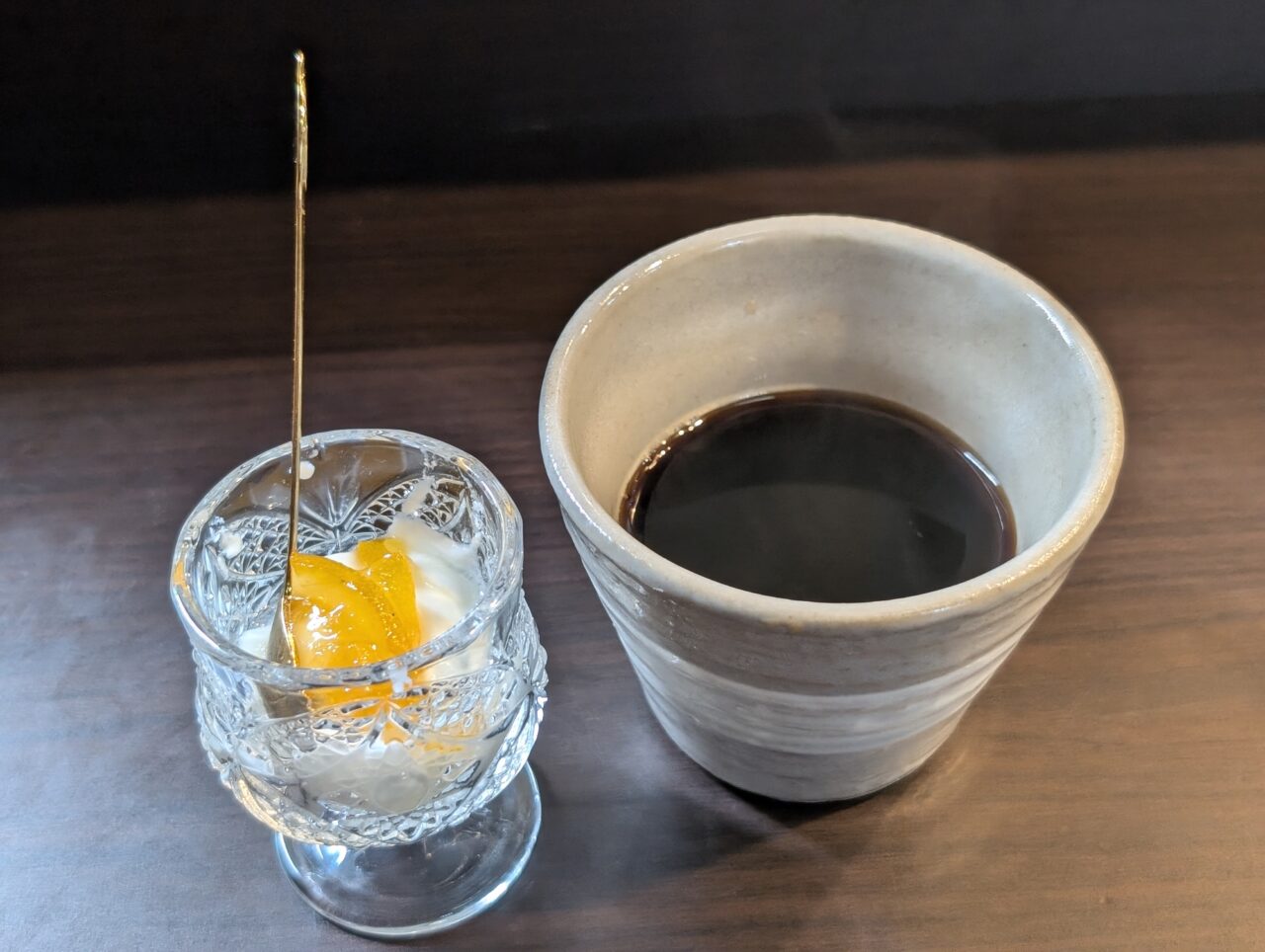食後にはミニデザートとコーヒーが付きます。ミニデザートのヨーグルトに乗っているマーマレードも手作りです。全てのお料理が心温まる手作りとなっています。